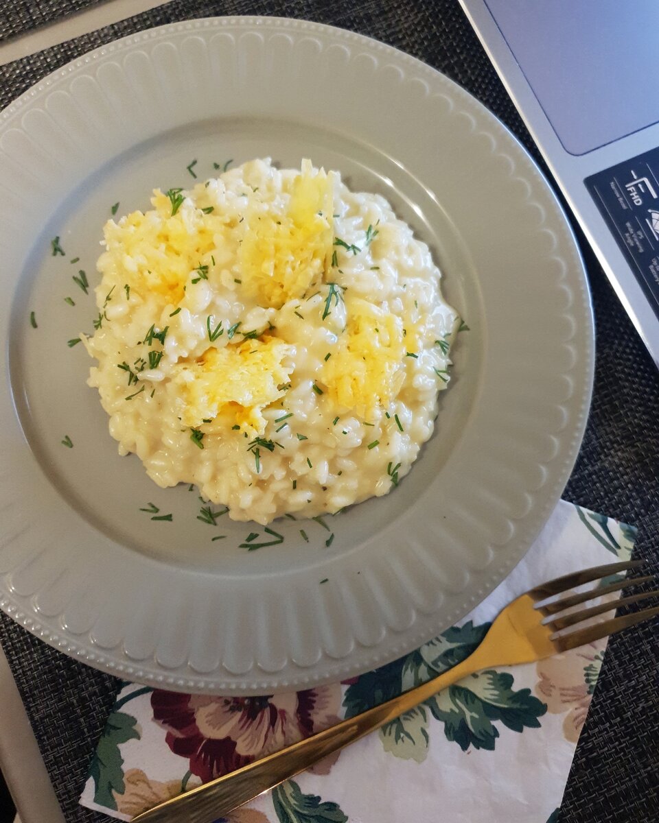 Я люблю пробовать что-то новое и пробовать это сделать сама. Проснулась утром и вспомнила тот вкус, который я пробовала в одном месте. Рецепта подходящего я не нашла, поэтому делала все на глаз. Но ризотто делала и до этого, но только с лососем и пармезаном. Над этим блюдом нужно заморочиться, но результат того стоит. И чипсы пармезана можно использовать, как хорошую закуску к вину. Пармезан ~ 200 грамм ( можно больше , можно меньше, он нужен только для чипсов) Камамбер ~ 150 грамм ( можно бри) Рис арборио 250 грамм Бульон куриный подсоленный ~ 700 мл Вино белое сухое 250 мл Сливочное масло 50 грамм Укроп для украшения Чеснок сушеный пол чайной ложки Сначала приготовим чипсы. Пармезан натереть на тёрке. Разогреть духовку до 180-200°, на противень постелить бумагу для выпечки, пармезан выложить тонким слоем любого размера как хотите, оставляя расстояния между ними. Поставить в духовку на 6-8 минут. Достать и охладить для хруста. На сковороду выложить масло и чеснок, чтобы м