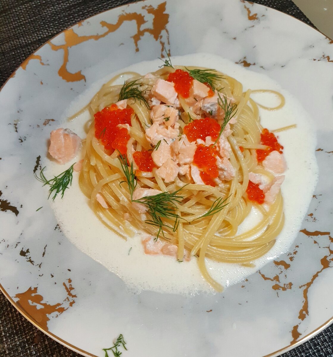 Паста в сливочном соусе с лососем и красной икрой
