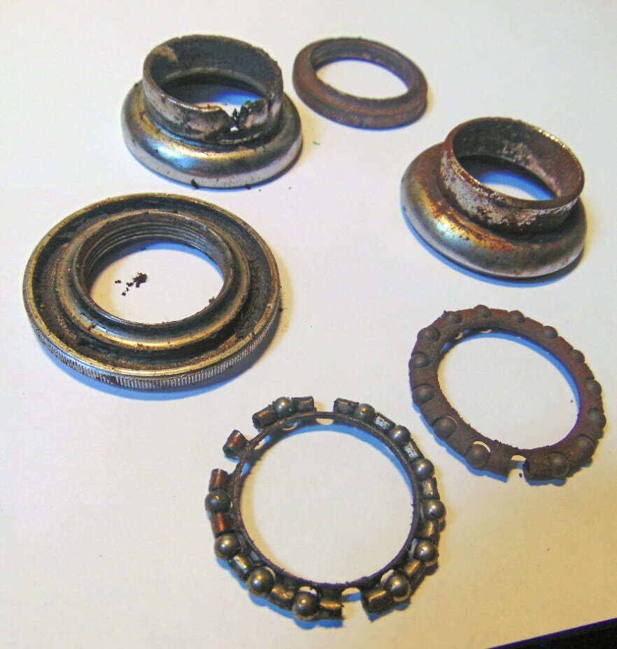 Сегодняшний мой день работы с велосипедом был полон борьбы. Обо всех моментах по порядку. Начал я с рулевой колонки: Она была в таком состоянии, и неудивительно что при таких мёртвых подшипниках не крутился руль. Но не в подшипниках было разочарование. Из-за того что на вилке сварной шов и на чашках есть такие вот «деформации» мягко говоря, в дальнейшем выяснилось что руление возможно не будет супер гладким при поворотах руля больше чем на 60-70 градусов. Все элементы рулевой колонки я постарался очистить настолько, насколько я смог: Да и тут новые подшипники, спасла меня моя запасливость для моего ХВЗ, когда я купил несколько комплектов. Подшипники стали в чашки хорошо. Но вилка не стала крутиться идеально, так как мне хотелось, видимо сказались годы и состояние штока вилки, конусов и чашек. Даже на этой фотографии уже видно что я поставил уже не только рулевую колонку. Рулевая колонка была самой наименьшей из бед за сегодняшний день. Самым большим разочарованием стала каретка.