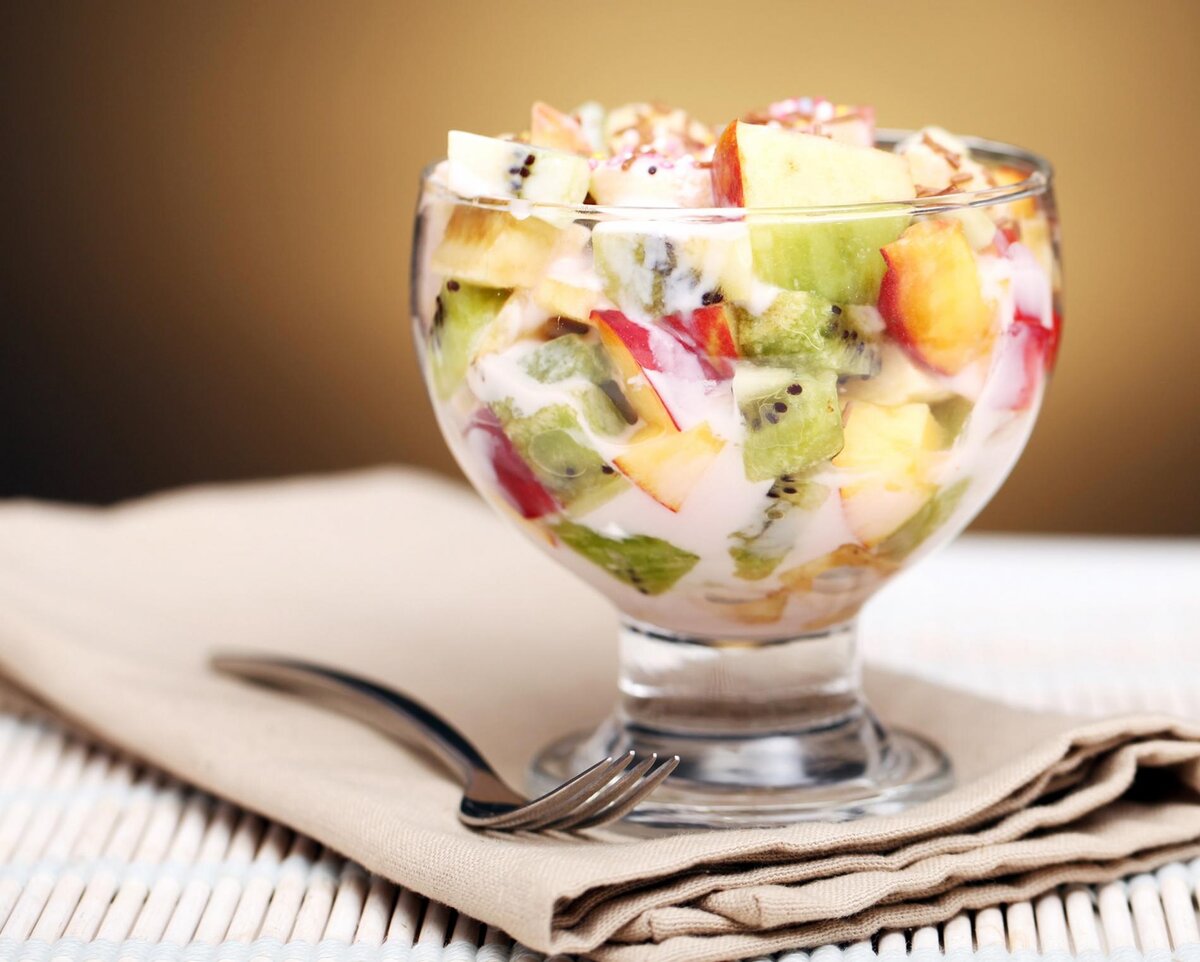 Десерт на все времена! Не потерял актуальность даже сейчас, когда разнообразие и доступность продуктов радует. Помню, мама готовила такой салат только по праздникам. Всегда на мой день рождения. Я ждала своих подружек, чтобы устроить конкурсы и чаепитие. И всегда был любимый фруктовый салат на десерт. До сих пор готовлю его сама, с особой теплотой в сердце и улыбкой. Итак, рецепт: Два обязательных ингредиента — спелые банан и груша. Без них салат не тот. Благодаря этим фруктам задаётся текстура, плотность, сладость и аромат десерта. Теперь обязательная составляющая — фрукт с кислинкой. Я больше всего люблю киви в этой роли, но подходят и апельсин, мандарин, свежий ананас. Также могут фигурировать и ягоды — идеально клубничка, малина, голубика. На этом шаге уже можно перейти к заправке — по тому рецепту из детства это баночка йогурта, сладкого, не «греческого». А до йогуртов это была сметана с сахаром. На современный манер — замените на кокосовое молоко, мороженое, взбитые жирные сли