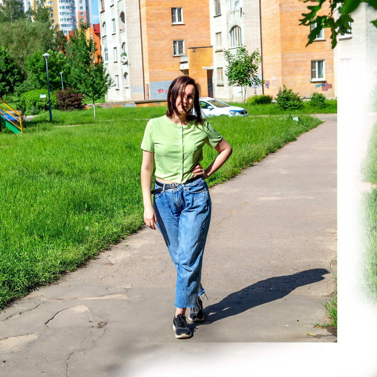 Футболка укороченная, трикотаж с рельефным слабо выраженным рисунком. Пройма удобная, ворот хорошо обработан. Пуговки пластиковые, петельки прорезаны. Размер L на параметры дочки 87-70-101 сел чуть свободно. Длина на рост 162см по талию. Пошив фабричный. Шовчики все ровные. Качество самого товара очень хорошее.