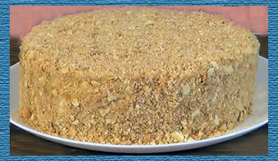 Теперь берем блюдо, и чтобы торт не ёрзал, кладем ложку крема. Так выравнивая и промазывая каждый корж доходим до последнего, но сверху торт пока не смазываем. Берем доску и прижимаем торт сверху (слегка прижимаем, т. к. коржи очень нежные), чтобы выровнять, и чтобы потом, пропитавшись кремом он не осел и после сборки не было сюрпризов. Теперь обмазываем весь торт и бока, и верхний корж и посыпаем крошкой, только не надо крошку делать сильно мелкой.