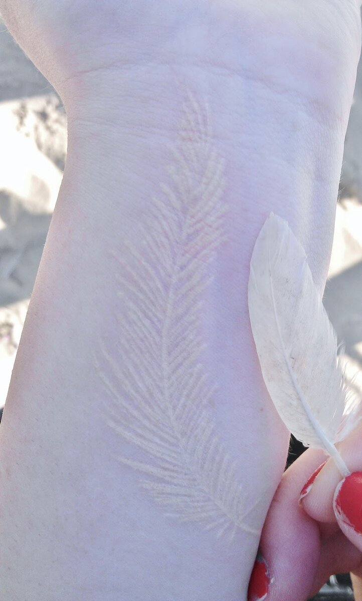 - Нежная, татуировка с изображением пера, выполненная белыми чернилами, - прекрасная идея для людей, мечтающих о небольшом, неброском рисунке.
