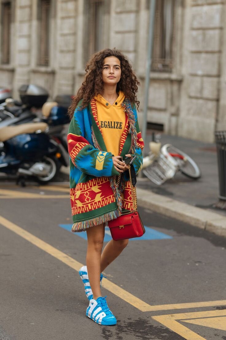 Данное течение характеризует обилие всевозможных принтов. В одном наряде могут уживаться и геометрия, и цветочек, и горошек. Эти принты могут быть везде и во всём, от верхней одежды до аксессуаров. Тягой ко всему яркому и пёстрому модницы обязаны погоде, зачастую хмурой и неприветливой. Необычная обувь, высокие яркие носки и платье в цвете вырви глаз – это всё про электику.