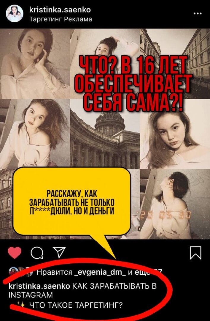 В свои 16 я обеспечиваю себя сама, работая онлайн. Все, что мне нужно - это Инстаграм аккаунт и Фейсбук. Я занимаюсь таргетированной рекламой, ее суть заключается в привлечении заинтересованной аудитории. Больше вы можете узнать из моего курса, который стоит всего 999 рублей! Там я подробно рассказываю, что и как делать. Пишите в Инстаграм kristinka.saenko