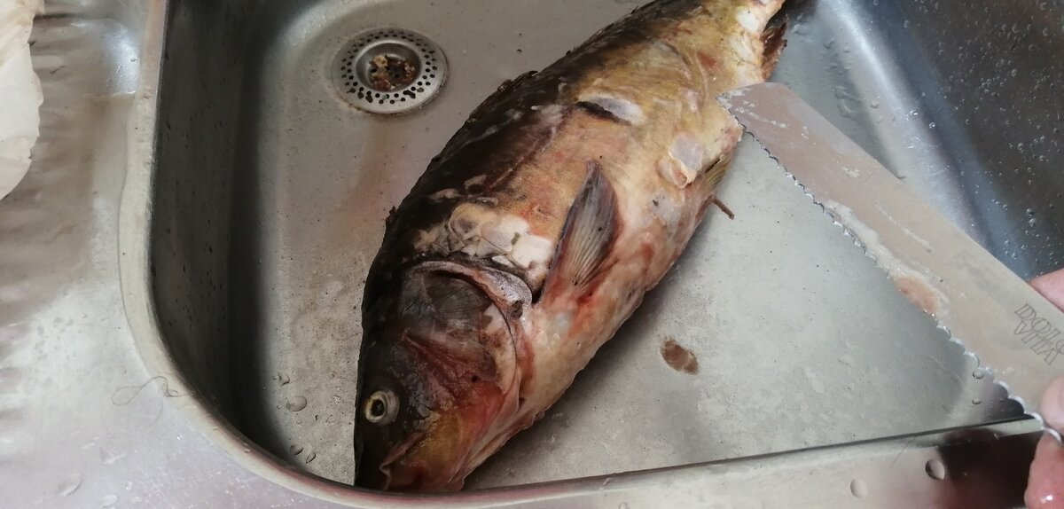 Всем приятного времени суток! Вчера сын преподнёс нам подарок, ездил на рыбалку и подарил вот такого зеркального карпа. Карпа не вешали конечно, но килограмма на три потянет точно. А вот непосредственно одна из фотографий с рыбалки. Естественно, сразу стали думать как его приготовить. Рецептов приготовления карпа в интернете очень много, но нам понравилось именно приготовление этой рыбы под сметано-майонезным соусом. Ну и внесли немного своего. Готовить любую рыбу в духовке очень просто, в принципе ничего сложного в этом нет. Для начала, самое главное это хорошо почистить рыбу, вытащить все внутренности и удалить жабры. Ну кто будет делать такую работу? Конечно же мужчина, то есть я. Работа кипит... Обязательно необходимо сделать в верхней части рыбы вот такие надрезы, это мы прочитали в интернете, якобы даже самые маленькие кости не будут нам попадаться. Хотя, забегу вперед и скажу, что костей в карпе очень много и этим она немного и отпугивает. Как только рыба готова к обработк
