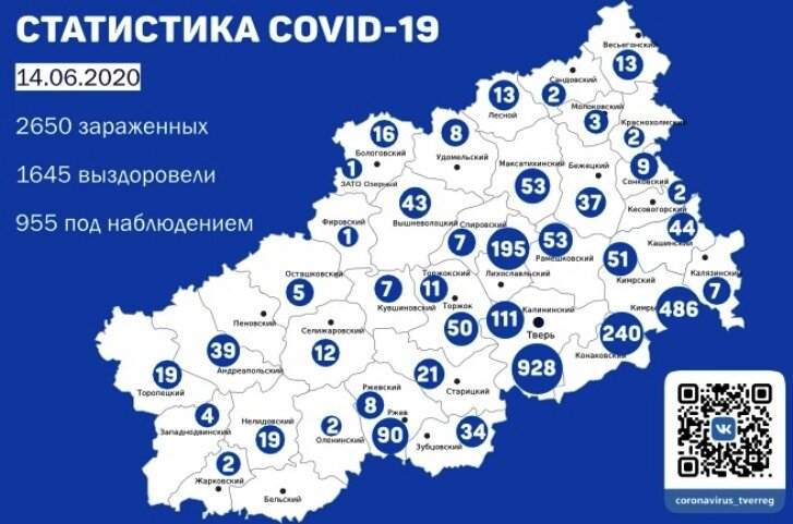 По данным на утро 14 июня, в Тверской области подтвержден 81 новый случай коронавирусной инфекции. За сутки выздоровели 26 человек, умерших не зарегистрировано. Общее число заразившихся в Тверской области в настоящее время составляет 2650 человек. Из них выздоровели 1645 человек, скончались 50 человек. «955 зараженных изолированы, находятся под постоянным наблюдением медиков и получают необходимое лечение, – сообщили в региональном оперативном штабе по предупреждению завоза и распространения коронавирусной инфекции. –Значительная часть людей с подтвержденным коронавирусом – без симптомов проявления заболевания. Проводится соответствующая работа с людьми, находившимися в контакте с гражданами, у которых подтвержден коронавирус». В России на утро 14 июня было зарегистрировано 8835 человек. Общее число заразившихся достигло 528 тысяч 964 человек. Из них выздоровели 280 тысяч 050 человек (5409 за сутки), умерли 6948 человек (119 за сутки).