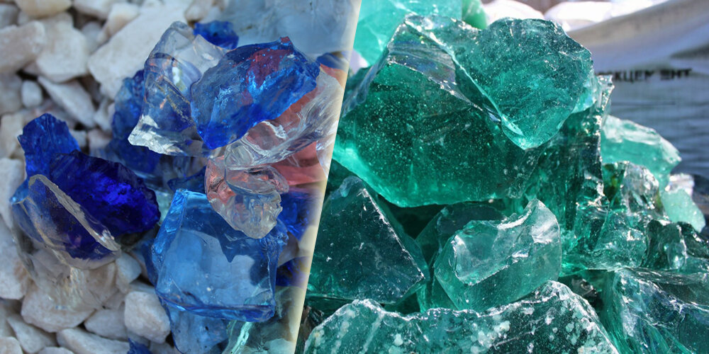 Стеклянные камни разной фракции оказались настоящей находкой для оформления ландшафта, проявив себя в разных вариантах.