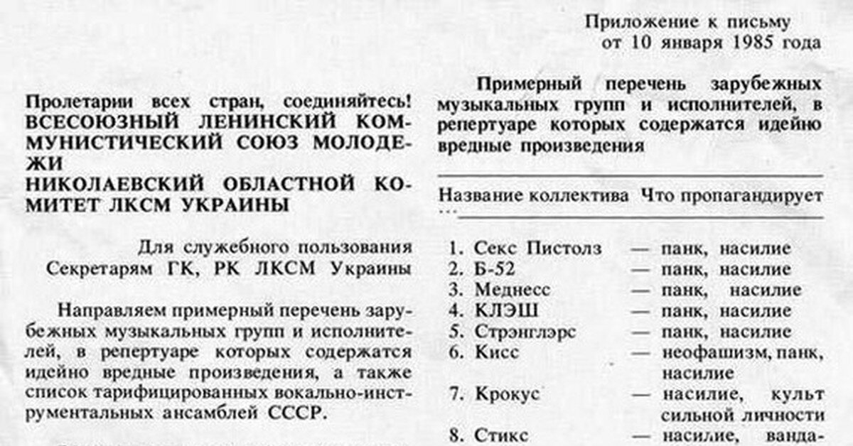 Думаю, не все ещё забыли, что западную музыку в определённые времена у нас запрещали. Мало того, существовали списки с перечислением конкретных групп и исполнителей, которые не рекомендовалось, да что уж там, категорически запрещалось слушать. За что и почему? Для этого тоже существовала колонка, в которой одним-двумя словами указывалась причина запрета, например, пропаганда панка, или вандализма. А общая формулировка гласила за «идейно вредные произведения в репертуаре». Сейчас не составит труда обнаружить в сети типичный образчик подобной инструкции, которые перепечатывались на пишущей машинке и распространялись по обкомам и райкомам.