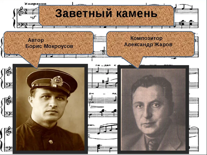 Выходные- время отдать должное культуре. После моего предыдущего поста о композиторе Мокроусове решил рассказать поподробнее о самых его популярных песнях. Самая известная Мокроусова конечно же "Заветный камень", песня о моряках-черноморцах. За нее композитор получил Сталинскую премию 1948 года. Борис Мокроусов сам успел послужить в начале войны в Севастополе, там же познакомился с поэтом Александром Жаровым. А толчком к написанию песни стал рассказ Леонида Соловьева "Севастопольский камень", в котором отступающие из Севастополя моряки взяли осколок городского гранита и поклялись вернуть его на место при освобождении. Слова Песня входила в репертуар многих исполнителей. Утесов не первый, но именно он ее популяризировал: Ефрем Флакс: Марк Рейзен: Людмила Зыкина: Юрий Богатиков: Евгений Нестеренко: Дмитрий Хворостовский: Максим Аверин: Мне больше всего нравится исполнение Богатикова и Хворостовского. У Аверину, честно говоря, позорное. Такое завывание стыдно выкладывать на общее обоз