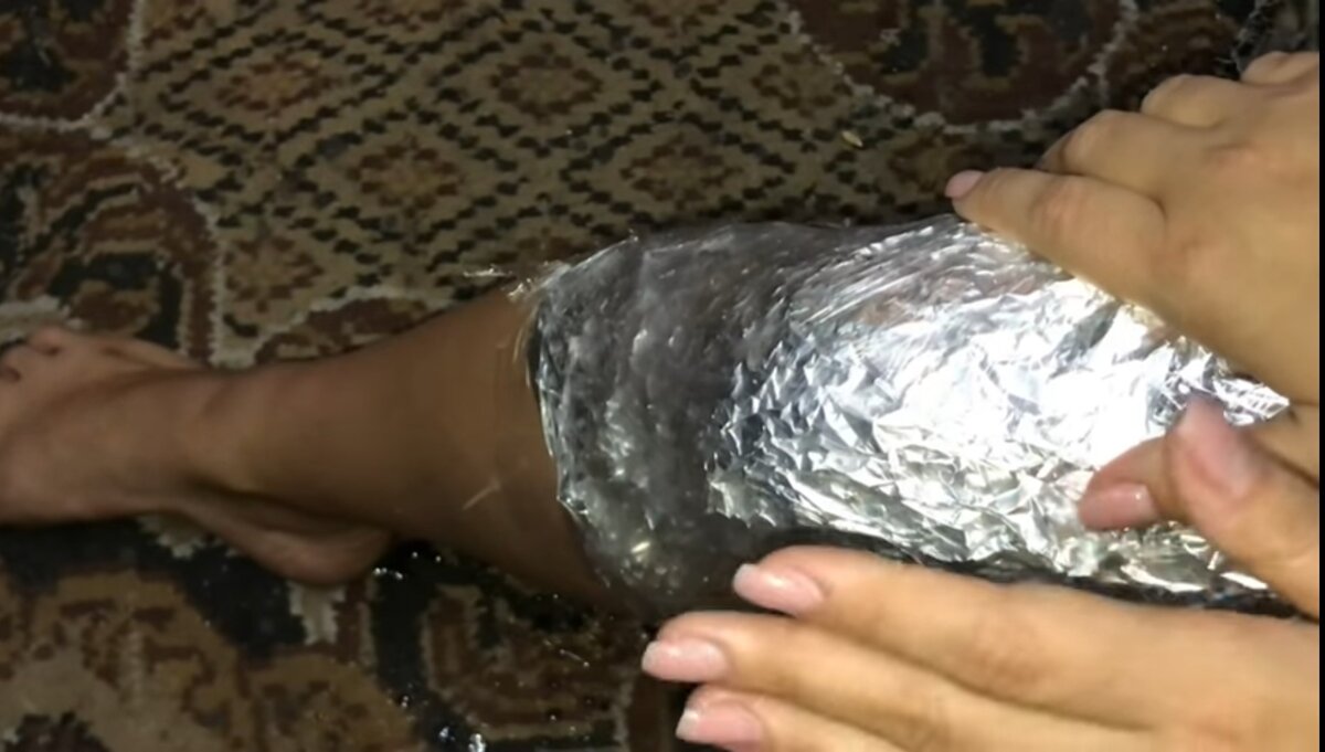 Затем мы берём пищевую плёнку и сверху ей заматываем ногу. Тоже не передавливать, нам спать с такой повязкой ночь.