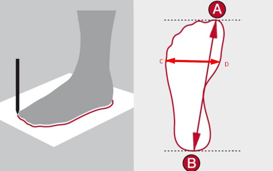 Актуальный вопрос – онлайн-покупки различных товаров. Это явление в нашей жизни возникло не сегодня. Масштабы его растут с каждым днем. Особенно возникают трудности при покупке обуви таким способом. Приобретение вещей и продуктов питания через интернет магазины – обычное дело. Покупка же обуви чаще осуществлялась в торговых центрах. Выбор удобной, комфортной модели, отличающей личным требованиям, вопрос очень щепетильный и субъективный. Жизнь не стоит на месте, вносит коррективы в наши привычки. Все чаще осуществляются онлайн-заказы. Пришло время познакомиться поближе с особенностями ног, точнее стоп. Что же нужно знать о них? Для решения этой задачи понадобится: Встаем на лист бумаги, переносим центр тяжести на стопу, аккуратно обводим ее карандашом, на рисунке находим две самые дальние точки (А-В). Измеряем расстояние между ними. Это длина. Далее при помощи сантиметра измеряем наиболее широкую часть (C-D). Это ширина. Осталось разобраться с объемом: путем обхвата стопы в самом высо