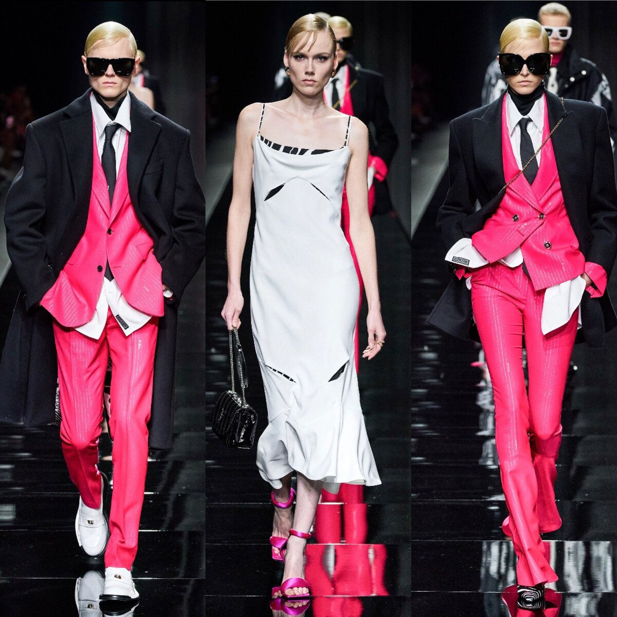 Донателла Версаче в своей коллекции Versace FALL’20 RTW объединила женскую и мужскую лини. Во времена, когда бесполость стала такой популярной, Версаче воспринимается последним оплотом стабильности. Она тоже решила не отставать и предложила шикарный розовый костюм для мужчин и для женщин, но, тем не менее, его гендерная принадлежность осталась, когда как у других дизайнеров она абсолютно стерта.