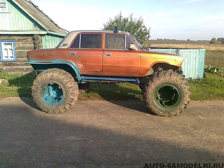 Деревенский умелец построил оригинальный вездеход для поездок по лесному бездорожью, на охоту, рыбалку, по ягоды и грибы Рама вездехода сделана из швеллеров, установлены мосты и раздаточная коробка от УАЗа. На раму установили кузов ВАЗа вместе с двигателем, КПП и навесным. Колёса сделаны из старых покрышек от ГАЗ-66, на покрышках вырезаны новые протекторы В результате переделки, дорожный просвет значительно увеличился 🙂 Вездеход отлично передвигается по глубокому снегу Также вездеход может передвигаться и держаться на воде за счёт больших колёс. На фото показано как вездеход преодолевает реку В результате из старых Жигулей, парень сделал вот такой настоящий внедорожник! Получился весьма добротный вездеход, правда расход топлива увеличился в два раза.