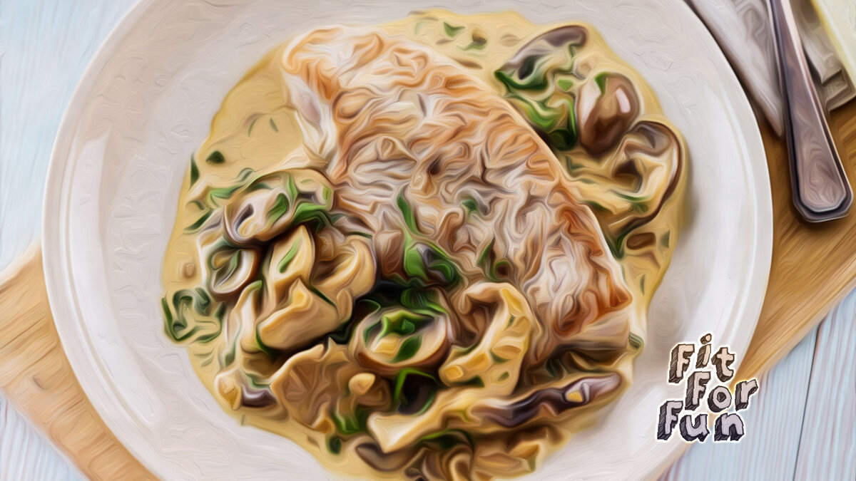 Народ, всем привет! Сегодня у нас не будет долго вступления и описания полезных свойств курицы, и куриных грудок в частности. Я думаю и так понятно, что это отличный источник белка, с минимальным количеством жира, а главное сытное и вкусное. И грудки не обязательно только отваривать, грудки нужно запекать в духовке, так они получаются значительно мягче и вкуснее. Ну а если к блюду добавить грибов, даже самых простых и доступных – шампиньонов, и залить все это дело низкокалорийным соусом, блюдо просто заиграет всеми вкусовыми красками. Попробуйте и точно не пожалеете. Но главное перед началом рецепта сказать все же надо – калорийность блюда и его БЖУ. В одной большой порции на одного человека будет примерно 200грамм курицы, что даст нам около 40грамм белков, и 8 грамм жира. Прибавим к этому белки из шампиньонов (примерно 150-200грамм) – это еще 5 грамм белка и соус на основе греческого нежирного йогурта, тоже коло 10 грамм. Итого на одну порцию выйдет примерно 55 грамм белка и около 10