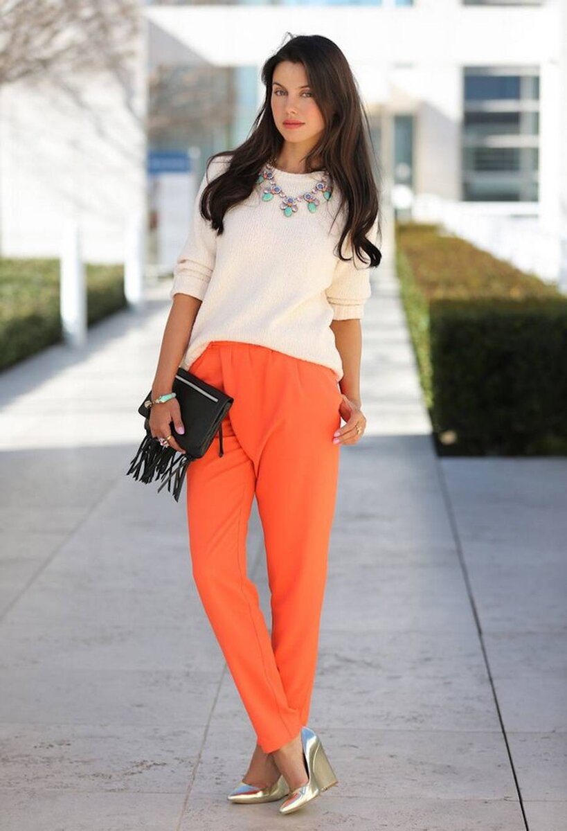 Белая блузка - это классика жанра, поэтому она практически подойдет к любому наряду. Белый нейтральный цвет отлично сочетается с любыми яркими цветами. Именно поэтому стоит взять во внимание этот достаточно простой повседневный образ. Контрастность между оттенками всегда привлекала внимание. Еще добавить можно классические лодочки или босоножки.