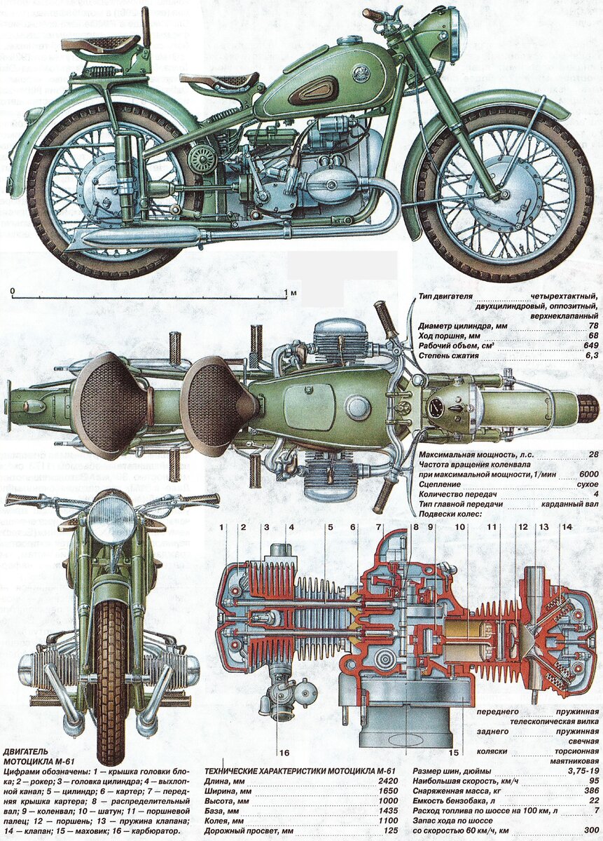 Им нравился «Пятьдесят второй» за быстроходность и меньший расход бензина без коляски на нем удавалось разгоняться до 120 км/ч. Они справедливо считали его шоссейной машиной и не без основания полагали, что, повысив мощность двигателя M-52, добьются желаемого превышения. Стремясь справиться с поставленной задачей, заводские специалисты приняли мудрое решение, увеличив диаметр цилиндров двигателя M-52 до 78 мм - как у М-72. Получился новый и очень удачный короткоходовый движок с рабочим объемом 650 см, развивавший мощность 28 л.с. при 6000 об/мин с таким же расходом топлива, как у меньшего по рабочему объему мотора «Пятьдесят второго». Его установили на все ту же ходовую часть М-72, а новую машину обозначили М-61. Ее проектированием руководил заместитель главного конструктора Аркадий Моисеевич Исаев. Она по многим показателям превзошла свой прототип, поэтому в 1961 г. ею на конвейере заменили и М-52, и М-72. Ее постоянно улучшали, вместе с модификациями она в общей сложности выпускалась 20 лет и дала богатый задел для создания на им3 более совершенных конструкций.