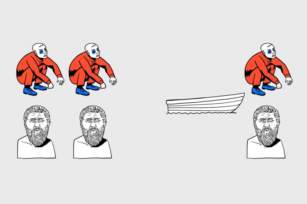 Это решение задачи на предыдущую статью Как перевезти гопников и философов с одного берега на другой. Если вы пропустили ее, прочтите обязательно. Для первой поездки есть пять вариантов: Значит, первым рейсом пара «философ-гопник» отправляется на другой берег: Теперь лодку надо как-то отправить назад. Но так как философ не умеет ей управлять, то он остаётся на берегу, а гопник — возвращается. Философы не взрывают никому мозг. Теперь прикинем варианты следующего рейса. Мы не можем отправить двух гопников, иначе философы останутся в большинстве, и настанет на левом берегу полный экзистенциализм. Поэтому снова на тот берег уплывают философ с гопником. Причём гопник высаживает философа, но сам из лодки не вылезает — если так не сделать, то он останется с двумя философами на том берегу и они увлекут разговорами об идеях вещей. Таким образом, у нас на том берегу сидят два философа, а на этом — один философ и три гопника, на которых он вряд ли сможет воздействовать силой дискурса.