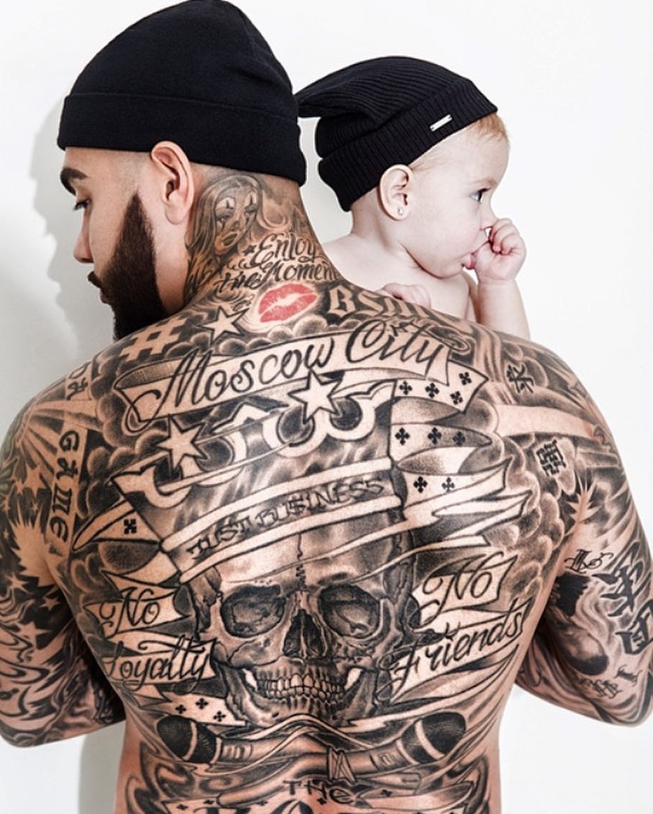 У знаменитого рэпера множество татуировок, и в каждую он, определенно, заложил свой сакральный смысл. Черепа, каллиграфия и прочие элементы густо украшают его тело. На шее у Тимура набито его собственное имя, а надпись “Moscow City” на груди намекает на место жительства.