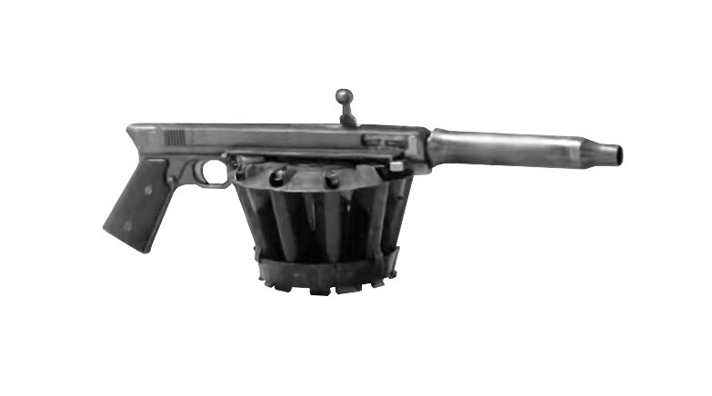 Вооружившись относительно новым пистолетом Кольта 1911, 10-ю магазинами к нему же, медвежьим капканом, мотком проволоки, 15-ю рулонами изоленты, бутылкой муншайна, аптечным бензедрином и предрасположенностью к шизофрении он снял на месяц номер в мотеле и никого туда не пуская, начал творить. Результатом этого стал, увы, не посмертный Оскар за лучшую мужскую роль, но хтонический, леденящий душу прототип без имени и славы. ОГРОМНЫЙ гомункул из 10-и пистолетных однорядных магазинов, вокруг которого растет, страдает и хочет умереть автоматический пистолет (пистолет-пулемет?) калибра .45ACP. Хоть и неизвестно, был ли 70-зарядный "барабан" автоматически вращающимся после истощения каждого магазина с 7-ю патронами или нет, оружие, похоже, имеет механизм, расположенный рядом с креплением барабана, который может быть автоматическим приводным устройством. Но это не точно. У оружия отсутствуют прицельные приспособления, приклад, цевье и