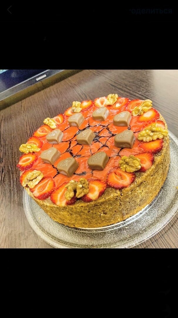Основа. 1. Печенье 280 г. 2. Масло сливочное 82% 120 г. 3. Грецкие орехи (не обязательно) 100 г. Ломаем печенье удобным вам способом, я просто раздавлю толкушкой. Вливаем в него масло и всыпаем орехи. Все перемешиваем и получаем липкую крошку. Форму 20 см застелить пергаментной бумагой и с помощью стакана или ложки сделать дно и борта. На дно должно уйти 2/3, остальное на стенки. Убрать форму в морозилку на 20-30 минут. Масса Чизкейка. 4. Сыр по типу Филадельфия 400 г. 5. Сахарная пудра 150 г. 6. Сметана 200 г. 7. Сливки 33-36% 150 мл. 8. Яйца С0 2 шт. 9. Крахмал кукурузный 2 ст. л. (Без горки) 10. Ванильный экстракт 1 ч.л. (ванильный сахар 1 пакетик) 11. Сок лимона 1 ст. л. 12. Клубничный сироп Растереть сыр с сахарной пудрой до растворения сахара, добавить в него сметану и сливки, и перемешать до однородности. Добавить в массу яйца поочередно, крахмал и ваниль. В конце добавить сок лимона. В итоге должна получится очень вкусная и нежная масса. Сборка и выпекание. Форму достаем из