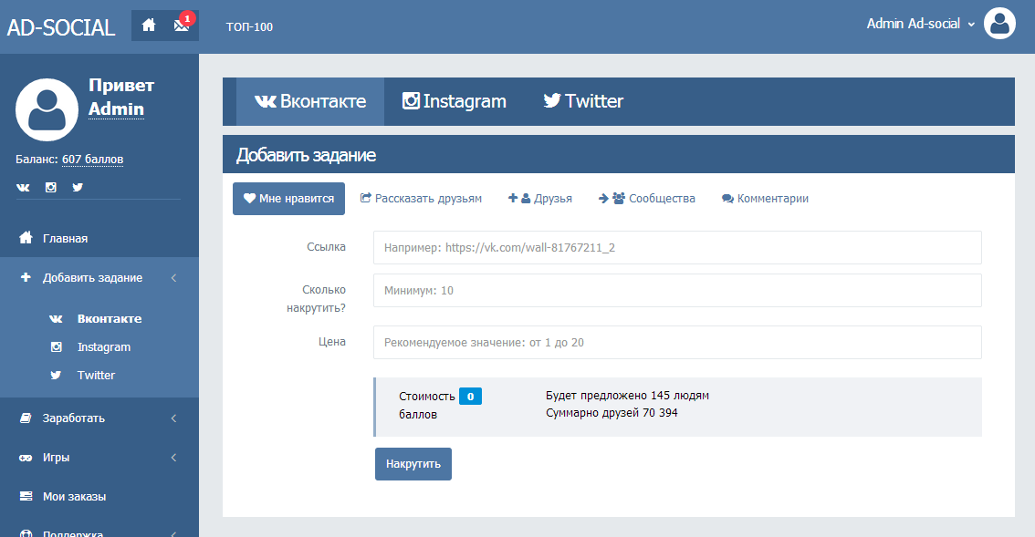 На сервисе ad-social вы можете совершенно бесплатно накрутить лайки и подписчиков Вконтакте. Для этого вам потребуются баллы - внутренняя валюта сервиса. Баллы можно заработать выполняя задания других пользователей или выиграть в специальных играх. Так же, сервис для раскрутки социальных аккаунтов, ad-social предоставляет ежедневные бонусы постоянным посетителям.