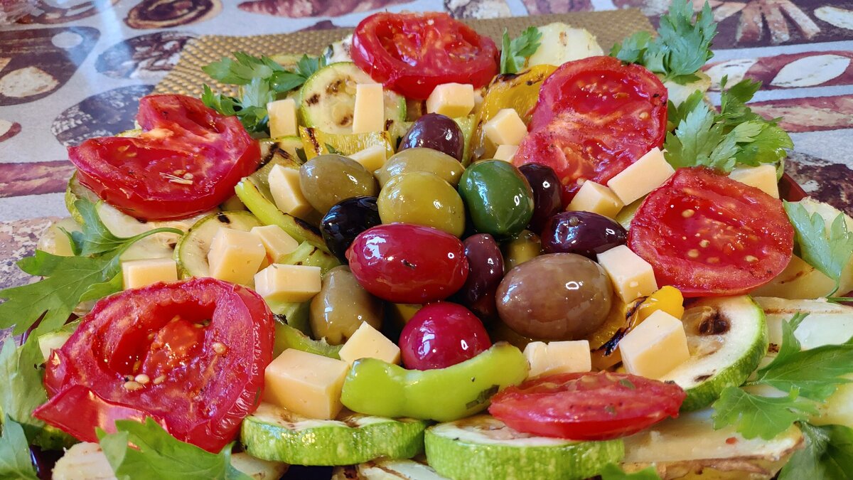 На днях муж заехал на рынок. Звонит оттуда: "Дорогая, я нашел наконец греческие оливки, которые давно хотел купить для тебя. Купил. Везу. Скоро буду". Дело было к ужину. У меня были планы, что приготовить, но новость с оливками требовала срочно их скорректировать 😉 Я решила приготовить овощи на сковороде-гриль. То, что получилось, превзошло мои ожидания! Теперь овощи-гриль стали одним из любимых блюд в домашнем меню У меня были свежие кабачки, болгарский перец, молодой картофель, помидоры, чеснок, зелень. Но, конечно же, можно добавить туда и баклажаны, и шампиньоны и любые другие любимые овощи. Фотографировать процесс времени не было. Расскажу на словах. Картофель я отварила в подсоленной воде до полуготовности. Потом его подпекла на гриль-сковороде. Кабачок, сладкий перец, помидоры порезала кружочками и запекла на гриль-сковороде. Особый вкус придает блюду ароматная заправка. Для ее приготовления смешать оливковое масло, лимонный сок, чеснок соль и зелень. .щедро сбрызнуть наши