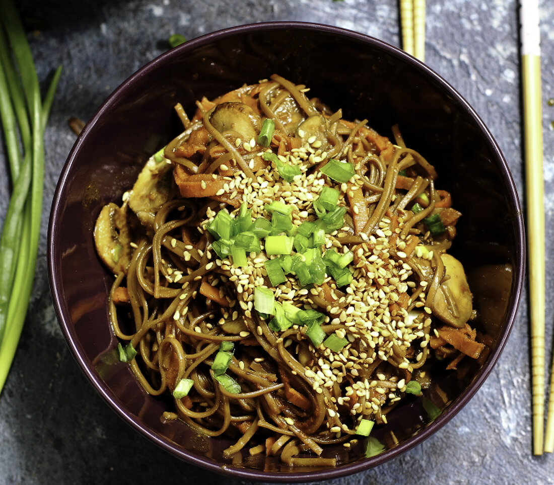 Ароматная лапша со сладковатой морковью, сочными грибами, пряным зеленым луком, с чесноком и имбирем, в густой заправке с хрустящими зернышками кунжута - м-м-м-м - это изумительно вкусно. Постная, полностью веганская, простая в приготовлении. Такое блюдо можно готовить с любой вашей любимой лапшой, хотя мой (и японцев) личный фаворит для таких блюд - это гречневая лапша соба. А по сути, можно использовать как рисовую, так фунчозу или пшеничную рамен или суомен, или даже самую обычную яичную (хоть постным блюдо уже не будет). Сейчас в любом супермаркете завидный выбор азиатской лапши на любой вкус и кошелек.