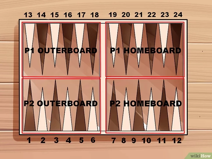 - Треугольники пронумерованы от 1 до 24 (для каждого игрока своя нумерация), причем пункт с номером 24 расположен дальше всего, а пункт под номером 1 находится в ближнем правом углу дома. Игроки перемещают свои шашки из противоположных концов доски, так что пункт 1 одного игрока для его противника имеет номер 24, пункт 2 – номер 23, и так далее.