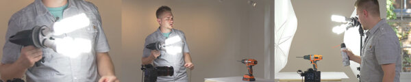 Скорее всего, у вас нет большой студии, как и у Брайна. Он снимает продукты для компаний по всей стране из своей домашней студии. На первом уроке в этом уроке Брайан хотел доказать, что съемка невероятного кадра не имеет ничего общего с вашей студией или вашим оборудованием. Брайан использует три недорогих светильника, чтобы создать изображение продукта беспроводной дрели. Объединив несколько разных экспозиций и добавив фон в Photoshop, он смог создать это изображение. Для следующего снимка Брайан использует еще один дешевый вариант освещения – обычные вспышки. Осветив один флакон духов и затем продублировав ее в Фотошопе, Брайан снова смог сделать простую, но прекрасно освещенную фотографию, не используя на дорогостоящее оборудование. Какую технику использует Брайан Брайан твердо уверен, что используемая вами техника не имеет значения, и что почти любая камера, объектив и система освещения будут работать. Итак, ради этого урока, Брайан использует ряд различных приспособлений, чтоб