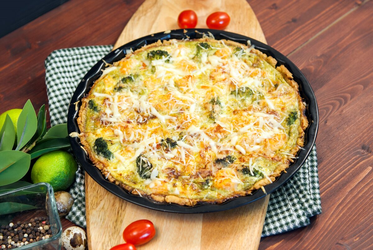 7. Готовый киш посыпаем сыром, даем остыть. При подаче украшаем зеленью. Приятного аппетита!