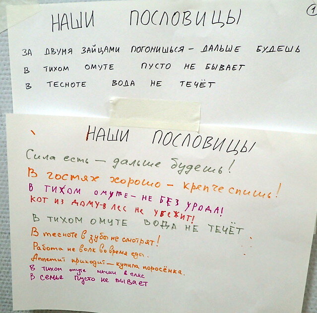 Тогда мы придумали такую игру: написали на бумажке в одном столбце первые части известных пословиц, во втором столбце - перепутанные продолжения.