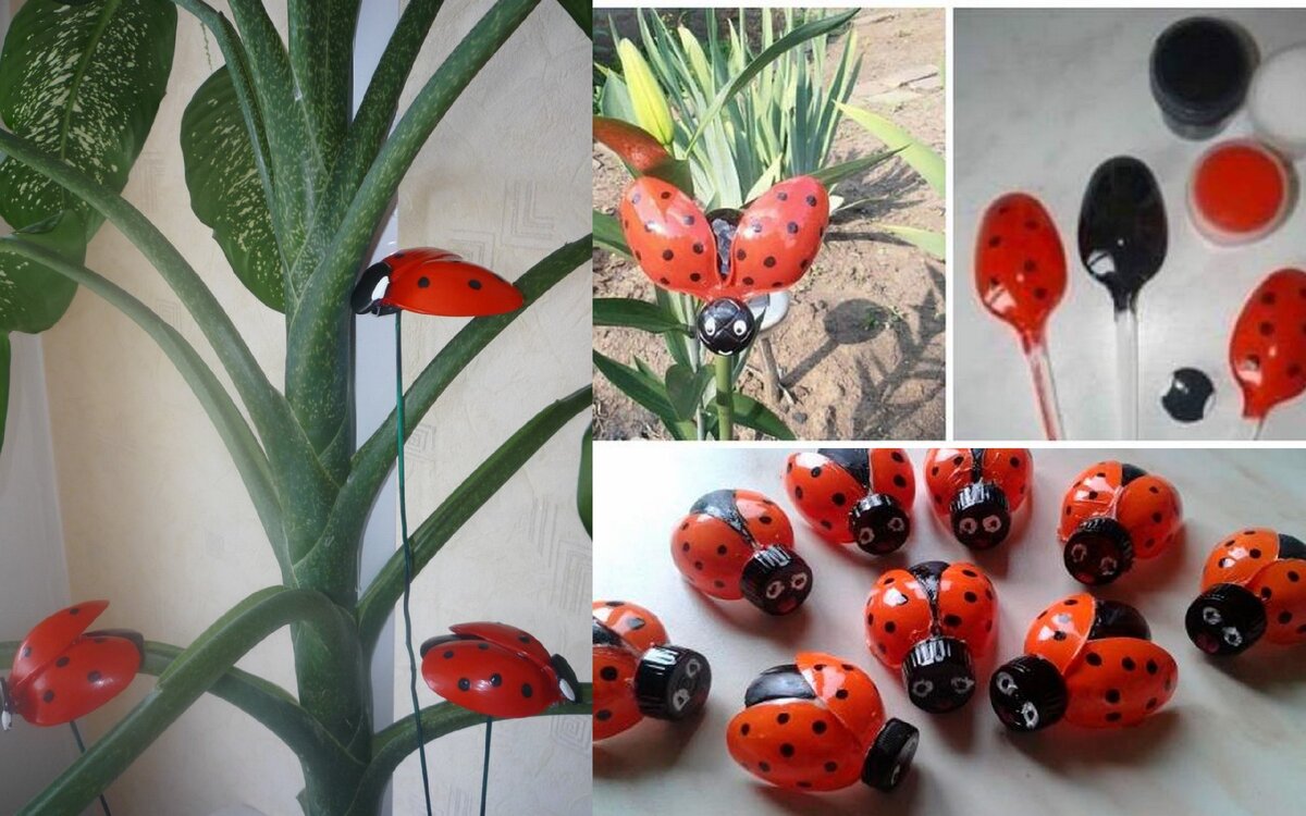 Обрежьте у трех ложечек ручки, немного оставьте , две из них покрасьте красным цветом, нарисуйте черные точки (крылышки), одну покрасьте черным цветом (туловище), на пуговице или крышечке нарисуйте белым цветом глазки (голова).