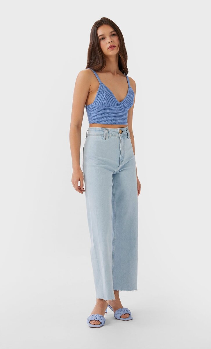Вы когда-нибудь замечали, что на человеке очень стильные вещи, но совершенно не сочетающиеся между собой? В современном мире очень важно уметь сочетать одежду. Если делать это неправильно, можно "испортить" даже самые трендовые вещи сезона. Я сделала для вас подборку образов из Stradivarius! Приятного просмотра! Бра-топ + джинсы + плетёные мюли Образ выполнен в спокойных голубых и лавандовых цветах. Он выглядит очень нежно и женственно. Все его детали прекрасно гормонируют и сочетаются друг с другом. Разберём каждую из деталей по отдельности. Топ-бралетт В 2020 очень популярны топы-бра. Актуальны бралетты из самых разных материалов: полиэстера, хб, кожа и т.д. Очень модные вязаные бра-топы. В этом сезоне актуален лавандовый цвет. Топ выполнен именно в таком оттенке. Ещё один тренд 2020 - глубокий V-образный вырез. Он характерен бра-топам. 1299 руб. Укороченные джинсы Сейчас короткие МОМ джинсы не так актуальны, как джинсы до щиколотки с необработанным краем. Они очень актуальны