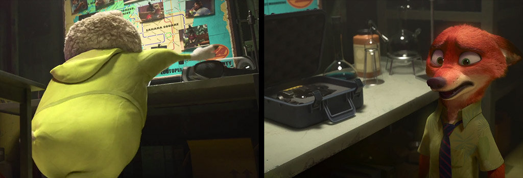 Перво-наперво — исчезновения и появления. Эта история совсем не зря детективная: пока Джуди разгадывает загадку тайного заговора против хищников, мы попробуем понять, кто же все время забирает вещи из-под носа героев. Например, ключи из лапки Джуди, когда пожилая самка броненосца заселяет ушастую полицейскую в скромную комнатушку, при этом попросив их не терять. Позже с приборной доски машинки Джуди бесследно пропадает блокнот. Во время просмотра данных с видеокамер в кабинете мисс Барашкис неожиданно исчезает монитор. Куда-то девается маска Дугласа, после того как снайпер кладет ее на стол во время телефонного обсуждения нового «заказа».