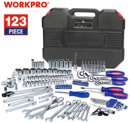Огромный набор качественных и долговечных инструментов от известной компании WORKPRO. Данный набор содержит в себе 123 различных инструмента и насадок, бит и переходников для совершенно разного типа задач. Инструменты выполнены из прочной стали, обладают прорезиненной рукояткой, которая даже при сильном давлении не прокручивается и не слетает со своего места. Отзывы у товара - крайне положительные.