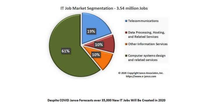 Около 117 000 IT-специалистов в США потеряли работу в период с марта по май 2020 года, как показывают последние данные правительства по занятости, отражающие влияние пандемии COVID-19 на IT-сектор, сообщает ZD Net. В то время, как в некоторых секторах отмечалось увеличение числа рабочих мест с апреля по май, количество рабочих мест в сфере IT неуклонно снижалось с марта по апрель и май. Как отмечает консалтинговая фирма Janco, Бюро статистики труда предоставляет данные для нескольких конкретных сегментов рынка: телекоммуникации, обработка данных, хостинг, проектирование компьютерных систем и другие информационные услуги. В марте на эти четыре сегмента рынка приходилось 3,655 млн. рабочих мест в США. Число рабочих мест во всех сегментах сократилось в апреле, а в мае они снова упали, составив 3,538 млн. рабочих мест. Учитывая текущую экономическую и социальную неопределенность в США, Janco заявила, что скорректировала свой прогноз для рынка IT-вакансий в 2020 году. Теперь она прогноз