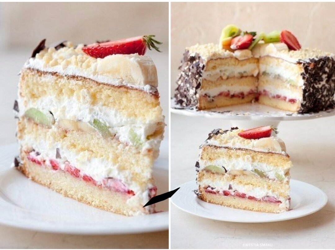 ИНГРЕДИЕНТЫ: Бисквит: ● 7 яиц - комнатной температуры, ● 1 чашка (200 г.) - сахара, ● 1 чашка (144 г.) - пшеничной муки, ● 1/3 стакана (50 г.) - кукурузного крахмала. Крем: ● 500 мл. - взбитых сливок не менее 30% жир. холодные, ● 250 гр. сыр - маскарпоне или Филадельфия холод., ● 5 ст. ложек - сахарной пудры. Фруктовое заполнение: ● 300 г. - любой ягоды по сезону, или замороженной, ● 2 - банана, ● 2 - киви, ● 100 гр.- шоколадных чипсов для отделки, ● Варенье клубничное. Для пропитки: ● Фруктовый чай, заварить и остудить, + 1 ч.л. - лимонного сока, ● Или ликер по желанию. ПРИГОТОВЛЕНИЕ: Готовим бисквит: Разогреть духовку до 180 градусов С (вверх /низ без конвекции). Муку соединить с крахмалом и перемешать. Отделяем белки от желтков. Начинаем взбивать белки на самой маленькой скорости миксера. Медленно, по одной ложке добавляем сахар и всыпаем ваниль. Взбиваем до жестких пиков. Когда белковая масса станет белой и довольно плотной, так же по ложке добавляем желтки, продолжая при этом