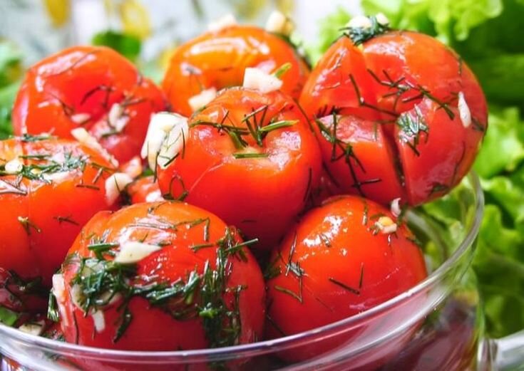 Приветствую вас, дорогие Хозяйки и Хозяева! Я продолжаю делиться с вами своими секретами приготовления различных заготовок. Малосольные помидоры черри с зеленью Ингредиенты: • зелень • специи • чеснок 3-4 зубчика • масло оливковое 1 ст.л. • соус соевый 2 ст.л. • помидоры черри 6 шт. Приготовление: Надрезать крестообразно каждую помидорку, перемешать порубленную зелень, с соевым соусом и специями, заполнить смесью разрезы. Переложить плоды в рукав для запекания, завязать, отправить ночевать в холодильник. Утром малосольные помидоры черри можно будет подавать к столу. Салат на зиму из огурцов с петрушкой Ингредиенты: • перец черный молотый 20 г • соль крупная 43 г • петрушка 1 пучок • масло растительное 53 мл • сахар 80 г • уксус 9% 95 г • огурцы 2.8 кг Приготовление: Овощи хорошо промыть, нарезать брусочками. Перемешать в большой емкости с сахарным песком, солью, молотым перцем. Влить растительное масло и столовый уксус, всыпать рубленую зелень петрушки. Смесь оставить для пропиты