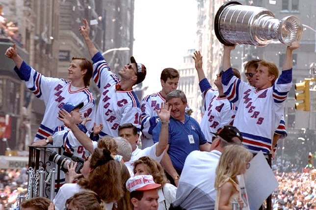 Как пел в одной известной песне Фрэнк Синатра: «I want to be a part of it, New York, New York…»(Как я хочу быть частью тебя, Нью-Йорк, Нью-Йорк!) Сегодня, мы станем немножечко частичкой этого мегаполиса. Вернемся в 1994 год, вспомним первый Кубок Стэнли с 1940 года, для легендарных Нью-Йорк Рейнджерс! Триумфаторы финала Кубка Стэнли-94 с главным трофеем едут по главным улицам Большого Яблока. Грейвз, Мессье, Лич, фото зашкаливающее легендарными личностями в истории «Рейнджеров». Марк Мессье, великий игрок, капитан Рейнджерс. В Нью-Йорк Марк попал в ходе обмена с Эдмонтоном. Провел за «синерубашечников» в общей сложности 10 сезонов (1991-1997 и 2000-2004). Сыграл в НХЛ феноменальные 1756 матчей (больше него матчей только у Горди Хоу), набрав в них 1887 очков. В сезоне 1993/94 Мессье вторым лучшим бомбардиром команды в регулярном чемпионате (84 очка за 79 матчей) и вторым бомбардиром в плей-офф (23 матча, 30 очков). Кубок Стэнли-94 стал для Мессье 6-м в карьере и увы, последним. Ст