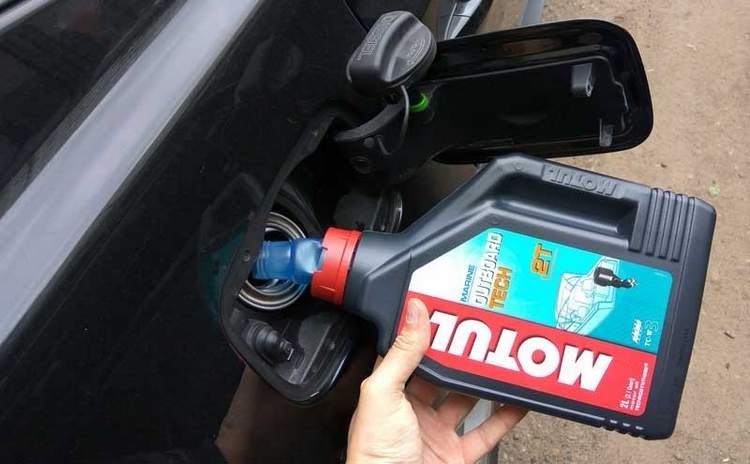 Масло добавляется в топливо в пропорции примерно 20-30 мл. на 10 литров топлива медицинским шприцем. Отмерять можно как во время заправки, так и после.