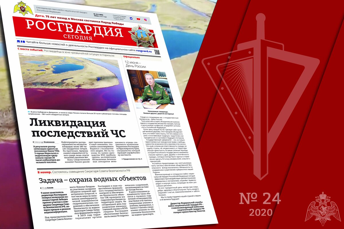 История легендарного Парада Победы. Росгвардейцы борются с последствиями аварии в Норильске. В Кабардино-Балкарии росгвардейцы уничтожили партию оружия. На Камчатке начинается оперативно-профилактическое мероприятие «Путина-2020». Эти и другие материалы в очередном номере газеты «Росгвардия сегодня». В номере: «В знамённо-орденском сиянье красив парада разворот» 75 лет назад 24 июня 1945 года в Москве на Красной площади состоялся легендарный Парад Победы. Ликвидируя последствия ЧС. Росгвардейцы в зоне чрезвычайной ситуации в Норильске. С вертолёта без парашюта! Занятия по десантно-штурмовой подготовке в Ростовской области. Жаркая пора на прохладных берегах Камчатки. Сотрудники Росгвардии примут участие в оперативно-профилактическом мероприятии «Путина-2020». Голосуй там, где удобно. Как и где голосовать по поправкам в Конституцию? Подписаться на газету можно в любом отделении Почты России. Индекс издания по каталогу Роспечати: 50157