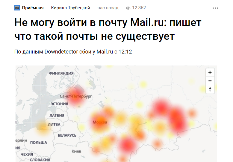 По всей стране невозможно запустить почту mail.ru Возникли проблемы. По сообщениям ряда тестеров, сбои в mail.ru начались 15 июня в 12 часов 12 минут. Аккаунты не работают. Люди переживают, так как на почте хранится много важной информации, и кому-то нужно передать почтой документы, кому-то дипломную работу, кому-то авиабилет. При попытке ВОССТАНОВИТЬ ПАРОЛЬ - жмем на надпись: "Забыли пароль?" открывается новое окно с сообщением красного цвета: Такого аккаунта нет. Хотя вы пользовались своей почтой еще час назад. Что делать в данном случае? 1. Позвонить: некуда. Такой службы у группы компаний mail.ru нет. 2. Написать письмо с просьбой восстановить почтовый ящик в службу поддержки на адреса support@corp.mail.ru support_mir@corp.mail.ru с другого рабочего адреса электронной почты и примерно сутки ждать ответа техподдержки и помощи в решении вопроса. Текст сообщения в техподдержку: Добрый день! Сегодня, 15 июня, у меня перестал работать почтовый ящик anapa777@mail.ru по непо
