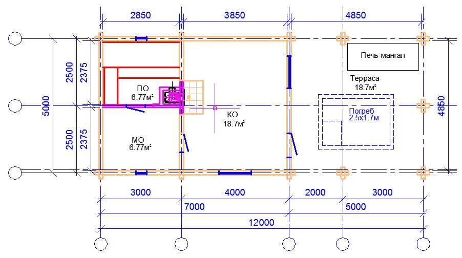 - Стены: профилированный брус 150*150 мм высотой 2.5 м, перегородка между помывочной и парной - каркасная (100 мм);