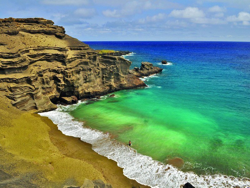 Сегодня мы снова предлагаем вам отправится в виртуальное путешествие. На этот раз мы хотим рассказать вам о необычном пляже, где под ногами в прибое можно увидеть не простой, а зелёный песок. Еще интереснее становится, когда узнаешь, что это не простой какой-то "зеленый песок", а самые настоящие хризолиты. Место это находится на южном побережье Большого острова Гавайского архипелага в Тихом океане. Его называют "Papakolea" или "Green Sands Beach" (т.е. "пляж Зеленые пески"). Весь берег в этом месте буквально усыпан мелкими кусочками хорошо окатанного хризолита. Он здесь появился в результате постоянного вымывания океаном частиц из обрушившегося шлакового конуса вулкана Пуу Махана, которому уже порядка 49 тысяч лет. Более плотная структура оливина позволяет ему оставаться на поверхности пляжа, в отличие от песка, который регулярно смывается. На пляж "Papakolea" лучше приезжать в ясную солнечную погоду. Солнце как источник света играет важную роль в цветопередаче побережья: в пасмурные