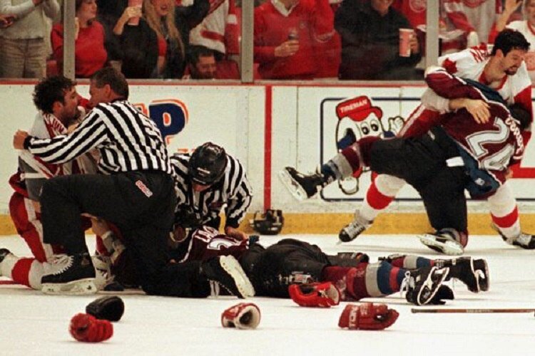 Всем привет! Сегодня, в «альбоме» будет третий и заключительный выпуск о Детройт Ред Уингз 90-х годов. (вот здесь первый, а тут второй) Мы вспомним об одном из самых легендарных противостояний тех лет: Детройт – Колорадо. В этом выпуске будет много фотографий драк, силовых приемов. Ну а что поделать, матчи между этими командами изобиловали силовым, грубым хоккеем. Сейчас, в современной НХЛ и не встретить такого зубодробительного противостояния. Ну, давайте вспомним о тех временах! Вот такой антураж сопровождал те встречи. Две команды, сильнейшие в лиге в то время, ненавидели друг друга. В матче финала Западной конференции 1996 года нападающий Эвеланш Клод Лемье атаковал в спину нападающего Ред Уингз Криса Дрэйпера… В результате того «хита» Крис получил перелом носа, сломал челюсть, повредил глазную и лицевую кость. Так же Дрэйпер получил травму шеи , сотрясение мозга, ну и выбил зубы. С тех пор Клод Лемье стал персоной нон-грата в Детройте. Этот толчок на борт, стал началом крова