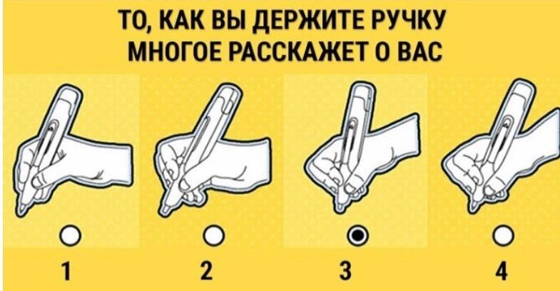 - Держите ручку, как на картинке под номером 2? Это характеризует вас, как интроверта. Незнакомых людей вы не подпускаете близко. Зато родные люди знают, какой вы отзывчивый и чуткий человек. На работе вас ценят за умение вовремя дать совет или подсказку. Вы умный и проницательный человек.