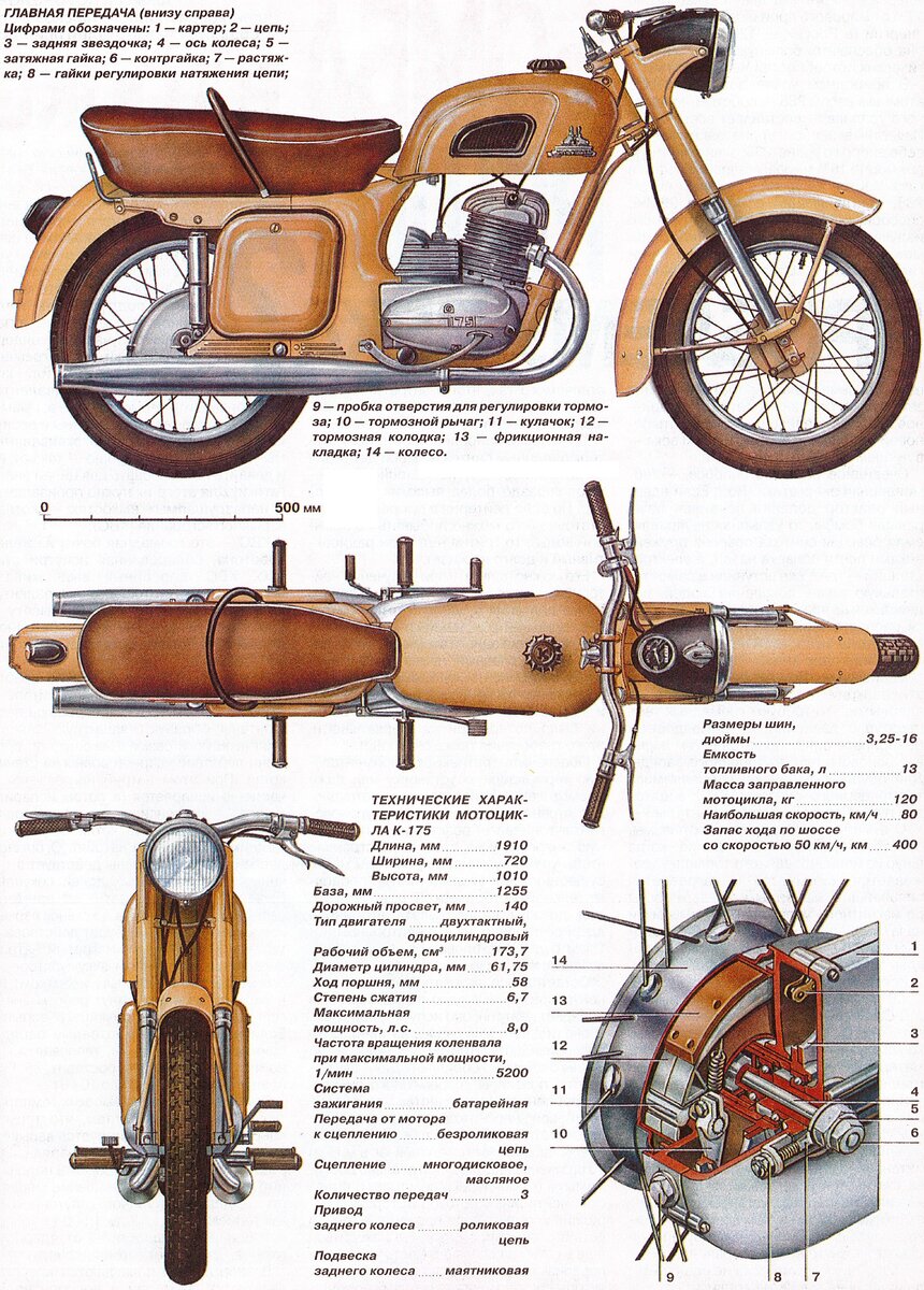 Вот как был устроен К-175. Внутри закрытой рамы расположили новый двигатель, скомпонованный как у прототипа с трехступенчатой коробкой перемены передач. Заднее колесо закрыли капотом, в боковинах которого разместили инструментальные ящики, а сверху расположили мягкое двухместное сидение, сзади которого закрепили хромированную скобу. К нижним трубам рамы прикрепили убиравшиеся подножки для ног пассажира. Цепь привода заднего колеса упрятали в Пыленепроницаемый кожух, крыло переднего Сделали более глубоким, сигнал разместили над ним, переключатель света и замок зажигания вмонтировали в фару, применили стоп- сигнал. Впервые в нашей стране на серийной машине использовали взаимозаменяемые колеса с 16-дюймовыми шинами.