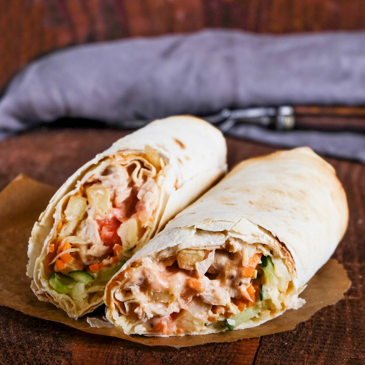 - Берем лист лаваша. Смазываем соусом поверхность, отступая от края на ширину, чуть большую, чем будущая шаурма, чтобы накрыть потом ее этим краем.
