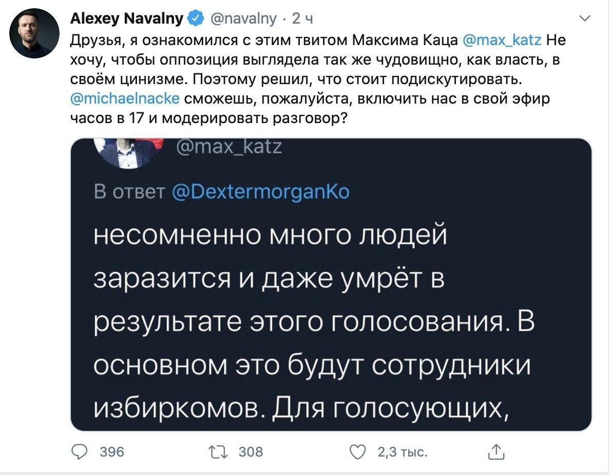 Дисклеймер: автор не является сторонником Каца или Навального, поскольку не поддерживает лево-либеральную повестку обоих, в тоже время автор против обнуления сроков Путина. Поэтому, сойдемся на том, что автор одинаково предвзят к обоим. Предыстория: Путин назначил 1 июля днем голосования за изменения в Конституции, то бишь за обнуление своих сроков. Навальный призвал не ходить. Кац сказал идти и голосовать против, затем вызвал Навального на дебаты по этому вопросу. Навальный сначала отказался, пару дней убеждал себя и сторонников, что с Кацем разговаривать не надо, что тот агент Путина и тд. В твиттере пользователи не оценили поведение Лёши и начали обвинять в трусости, в результате чего тот внезапно соглашается на дебаты, перечеркивая все свои предыдущие аргументы о том, почему нельзя дебатировать с Кацем. Для тех, кто максимально ценит своё время или кому попросту лень, тот может прочесть два следующих предложения, закрыть статью и ровным счетом ничего не потерять: Позиция Каца в тр